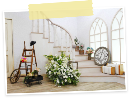結婚式の撮影シーンでキッズ撮影ができます。結婚式場内ならではのオシャレな空間でのロケーション撮影が可能です。